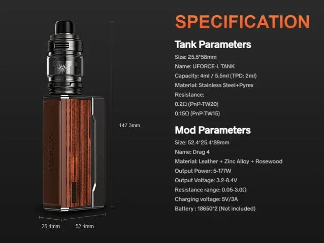 شيشة دراق 4 من فوبو Voopoo drag 4 kit نقدمه لكم اليوم من متجر فيب ريلاكس الأول في المملكة العربية السعودية. من أفضل اجهزة الشيشة الالكترونية مع طاقة اخراج تصل حتى 177 واط ، مقترنًا بشكل طبيعي مع UFORCE-L Tank، يتم تشغيله بواسطة بطاريتين 18650 خارجيتين تباع بشكل منفصل.