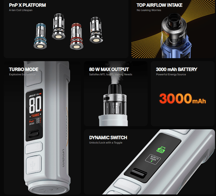 تتميز بودات PnP X أنها مغناطيسية بسعة 5 مل، مصنوعة من الفولاذ المقاوم للصدأ الممتاز وPCTG، مع نظام تعبئة علوي يمنع تسرب السوائل، وتستوعب كويلات سلسلة Press-Fit PnP X مع قوة كهربائية قابلة للتعديل، ونطاق مقاومة من 0.15 (80 واط كحد أقصى) إلى 0.3 (42 واط كحد أقصى) أوم، وثلاثة أوضاع (Smart، RBA، Turbo)، يوفر Argus Pro 2 تنوعًا وتطورًا لرحلة vaping لا مثيل لها.
