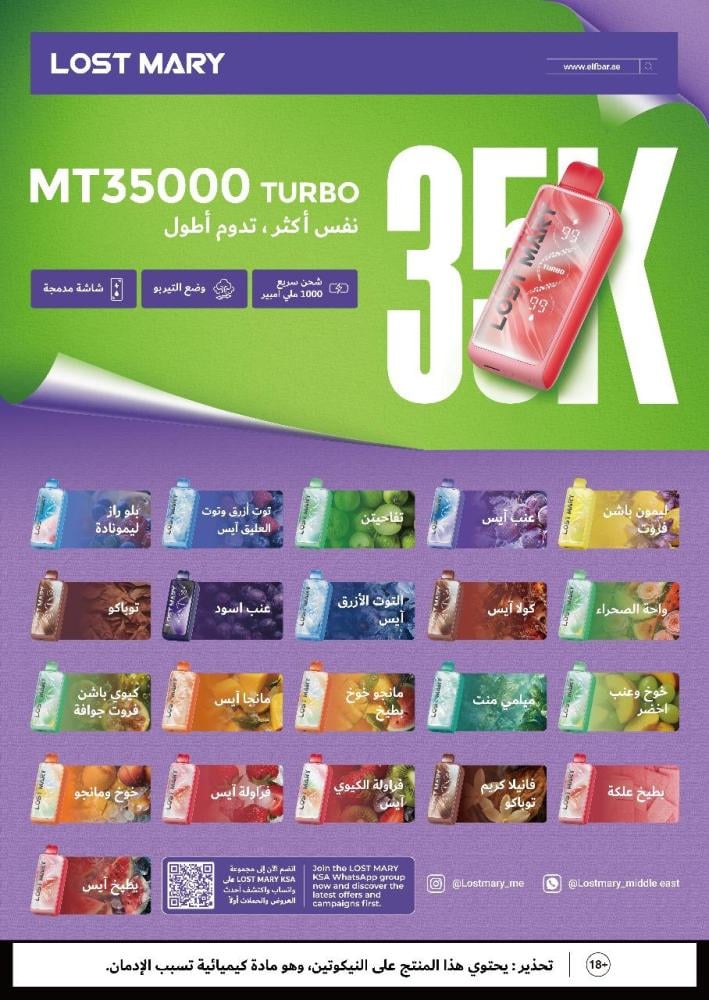 التيربو ما هتقدر عليه! مع سحبة لوست ماري ام تي 35000 موشة بقوة 1000 مللي أمبير بوضع التيربو القوي لتحصل على نكهة قوية وأداء موثوق، مع أقصى درجات المتعة والانتعاش .. سحبة الكترونية لا تقاوم!